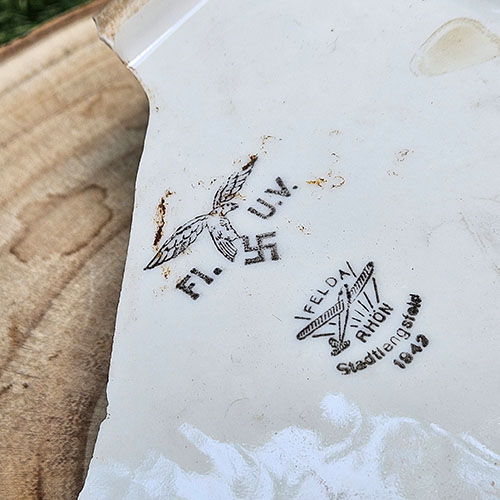 The bowl has suffered damage over time and remains approximately half complete. Despite this, both the Luftwaffe markings and factory stamp are still visible, ensuring its value as a genuine relic. Items like this offer a rare glimpse into the daily life of Luftwaffe personnel and remain increasingly difficult to source in any condition. A genuine and dated Luftwaffe porcelain piece, this bowl is a strong addition for collectors of WWII German militaria, Luftwaffe artifacts, or porcelain history. The size of this item is 8,3 x 8,3 inch (21 x 21 cm).