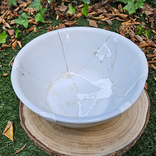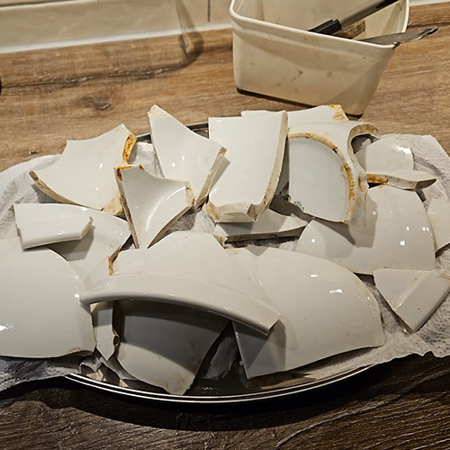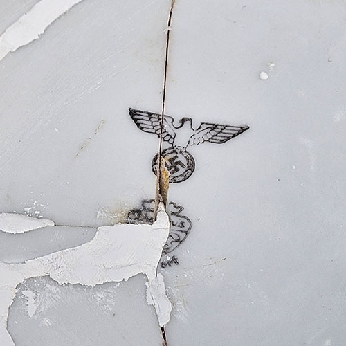 This is an authentic Wehrmacht porcelain bowl, originally issued during the Second World War and decorated with the Wehrmacht eagle. The piece was manufactured by Rhenania Duisdorf Bonn, a known German porcelain producer that supplied tableware to the armed forces. Although the factory stamp on the underside is only partially preserved, it remains recognizable and confirms the bowlโs origin. The bowl was recovered in fragmentary condition and has been carefully restored by Chris himself. The original shards were painstakingly glued together, and the missing gaps were filled with a professional porcelain repair kit, leaving the bowl structurally complete once again. All restoration work was done with great care to preserve the authenticity and historical character of the piece.